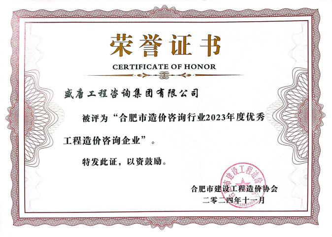 2024年11月,盛唐公司被评为合肥市造价咨询行业2023年度优秀工程造价咨询企业