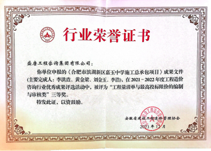 2023年7月,盛唐集团荣获2022年度合肥市建设工程造价协会优秀工程造价咨询企业
